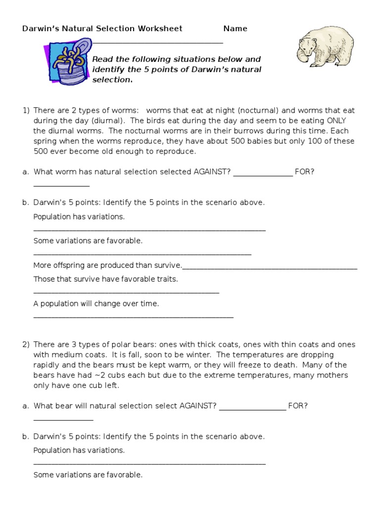 Darwin s natural selection worksheet answers thick coats identify darwin s 5 points of natural selection in the scenario above.5 points of darwins natural selection.Worms that eat at night nocturnal and worms that eat during the day diurnal.