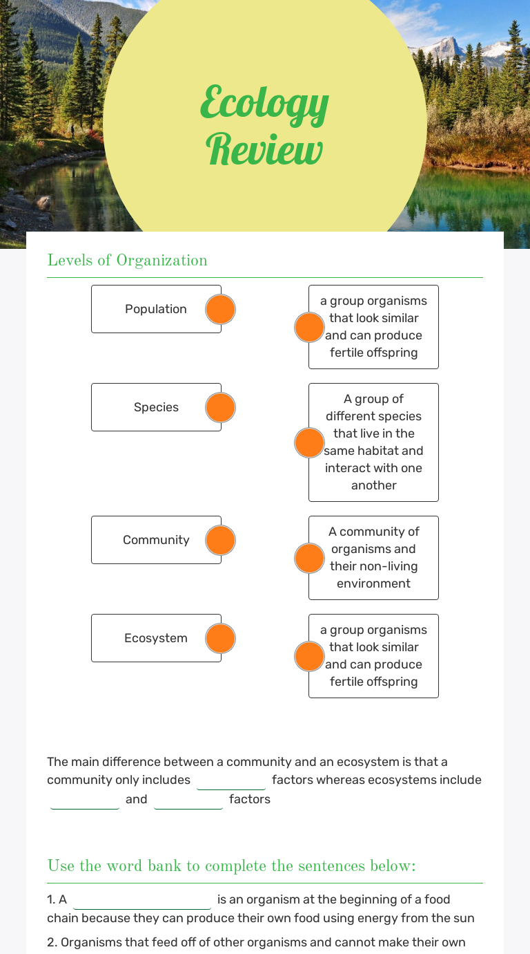 Ecologists study environments at different levels of organization.Ecology review worksheet 1 flashcards quizlet ecology review worksheet 1.Also provide an example for each level.