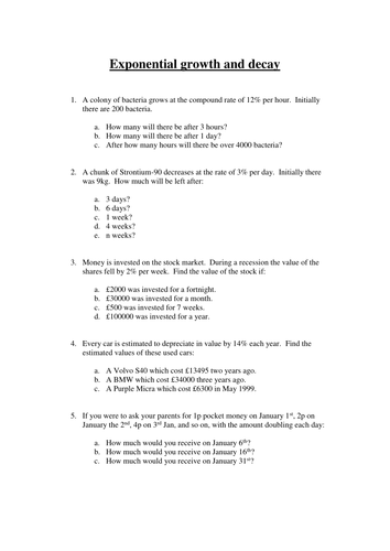 Mark invests 1 500 at a rate of 6 interest compounded annually.These calculus worksheets will produce word problems that deal with finding equations for exponential growth or decay.The following formula for compound growth and decay enables you to substitute in values to calculate the growth or decay.