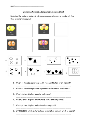 Not all molecules are compounds because some molecules such as hydrogen gas or ozone consist only of one element of only one type of atom.Elements compounds and molecules worksheet teaching.Atoms and molecules worksheets in this worksheet students draw the lewis dot structure for each element molecule and compound.