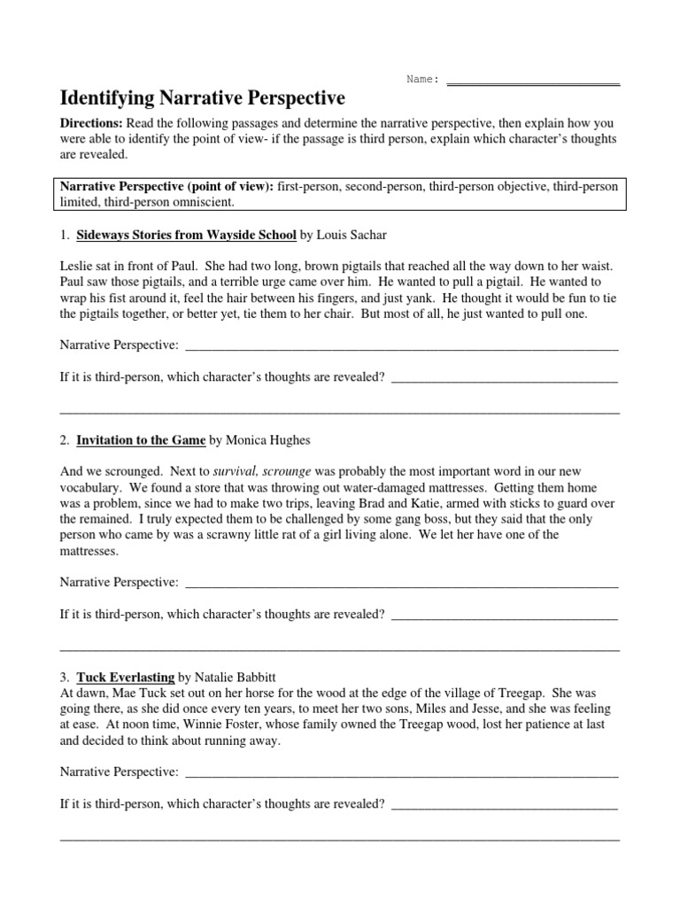 This is a 4 page worksheet with 19 more problems on narrator s perspective.Point of view worksheets ereading worksheets point of view worksheet 1 here s an awesome worksheet to give students practice with recognizing the narrator s viewpoint.The second person point of view attempts to draw the reader to be a participant in the story.